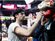 PORTLAND, OREGON - FEBRUARY 01: Deni Avdija #8 of the Portland Trail Blazers signs an autograph for a basketball fan before the game against the Cleveland Cavaliers at Moda Center on February 01, 2026...
